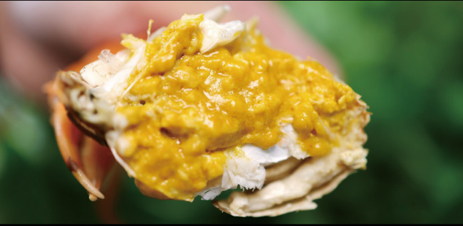 每逢炎夏,青母蟹會(huì)在產(chǎn)卵時(shí)棲身于淺灘河畔,在陽(yáng)光的照射下,體內(nèi)的蟹膏分解成金黃色的油脂,然后滲透到體內(nèi)的各個(gè)部分,使得整只蟹晶瑩剔透、充滿黃油,因此被稱為黃油蟹。